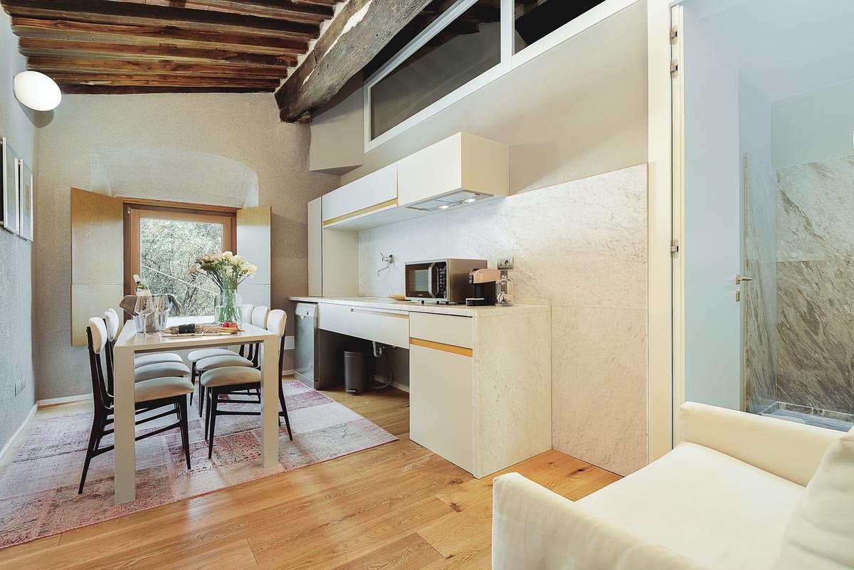 Le pareti della Suite sono realizzate con intonaci di pura calce naturale a grana molto grossa intervallati con parti di nuova muratura a rasatura liscia, colori nelle terre naturali. I pavimenti sono in massello di rovere. Gli arredi sono su disegno esclusivo. Nel grande soggiorno un camino in acciaio e legno di Olmo occupa una intera parete, completano l’arredo un divano a tre posti e una chaise lounge di fabbricazione americana anni 60’. Al soffitto un lampadario Venini anni 50’ .Tutti i locali della Suite hanno soffitti in legno di castagno a doppia orditura e mezzane in cotto. Un lungo lavoro di restauro e consolidamento ha consentito il mantenimento delle strutture originarie. Tre le camere matrimoniali ognuna corredata di bagno: le due camere a Sud hanno una bellissima vista mare di cui una, d’angolo, inquadra a est le colline limitrofe a vigneto. Questa camera ha ad uso esclusivo uno studio con divano letto. Particolare cura è stata prestata all’architettura interna dei bagni con l’uso di marmi delle Alpi Apuane in lastre di grande dimensione e lavelli in massello scavato. Completano le dotazioni tappeti d’epoca e una collezione di stampe autentiche di varie epoche. A disposizione degli ospiti un bollitore con un kit del tè e del caffè e tazzine.