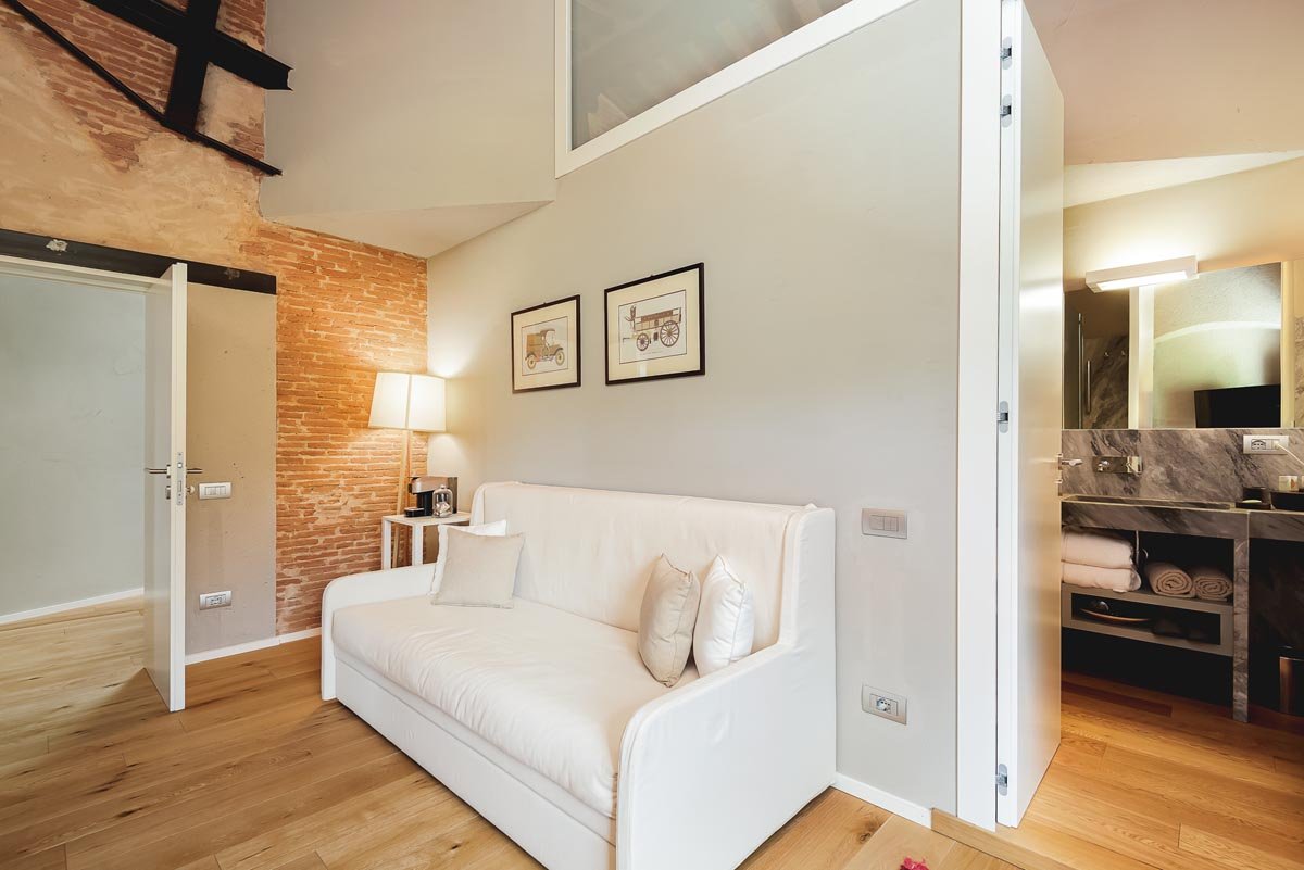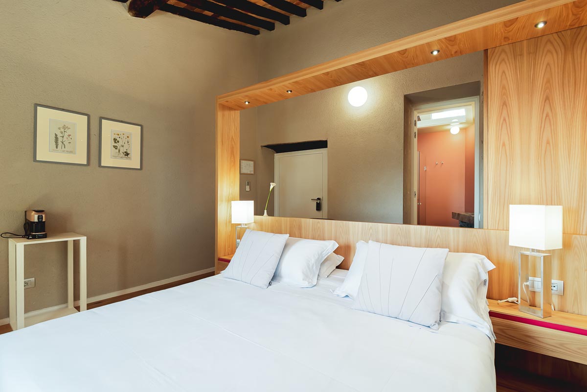 Situata al secondo piano della Villa, nella parte originariamente adibita a Fattoria, questa grande Suite è caratterizzata da una autentica architettura contadina fatta di spazi intimi e accoglienti reinterpretati in chiave contemporanea attraverso l’uso di arredi e elementi architettonici di complemento. Si accede alla Suite dalla parte Est della villa attraverso una scala in marmo locale antico contenuta da due pareti in mattoni fatti a mano sapientemente ripuliti e trattati a cere naturali. Dalla scala si accede poi a un grande soggiorno con tetto a vista originale ottocentesco con squarci di luce provenienti dalla collina soprastante. Si affacciano sul soggiorno tre camere matrimoniali con bagno esclusivo, una cucina, uno studio e, attraverso un disimpegno, è possibile accedere direttamente all’oliveto e a due piccole terrazze ad uso esclusivo. Tutti gli ambienti sono caratterizzati dal tetto a vista – originale ottocentesco – in travi di castagno e mezzane in cotto.